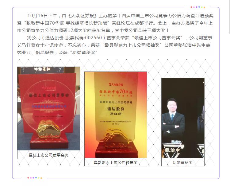 通达股份荣获中国上市公司竞争力公信力调查评选三项大奖!
