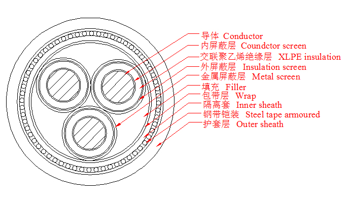 3.6/6~26/35kV三芯交联聚乙烯绝缘钢带铠装电力电缆产品结构示意图
