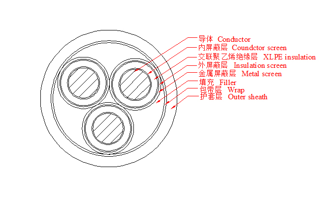 3.6/6~26/35kV三芯交联聚乙烯绝缘电力电缆产品结构示意图