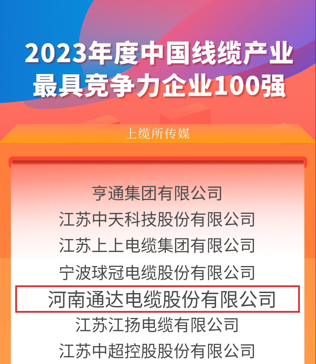 2023年9月3日,“2023年度中国线缆产业最具竞争力企业”授牌仪式在万众瞩目中隆重举行,河南通达电缆股份有限公司荣登“2023年度中国线缆产业最具竞争力企业100强”榜单,至今通达已经连续七年荣获中国线缆产业最具竞争力百强企业。