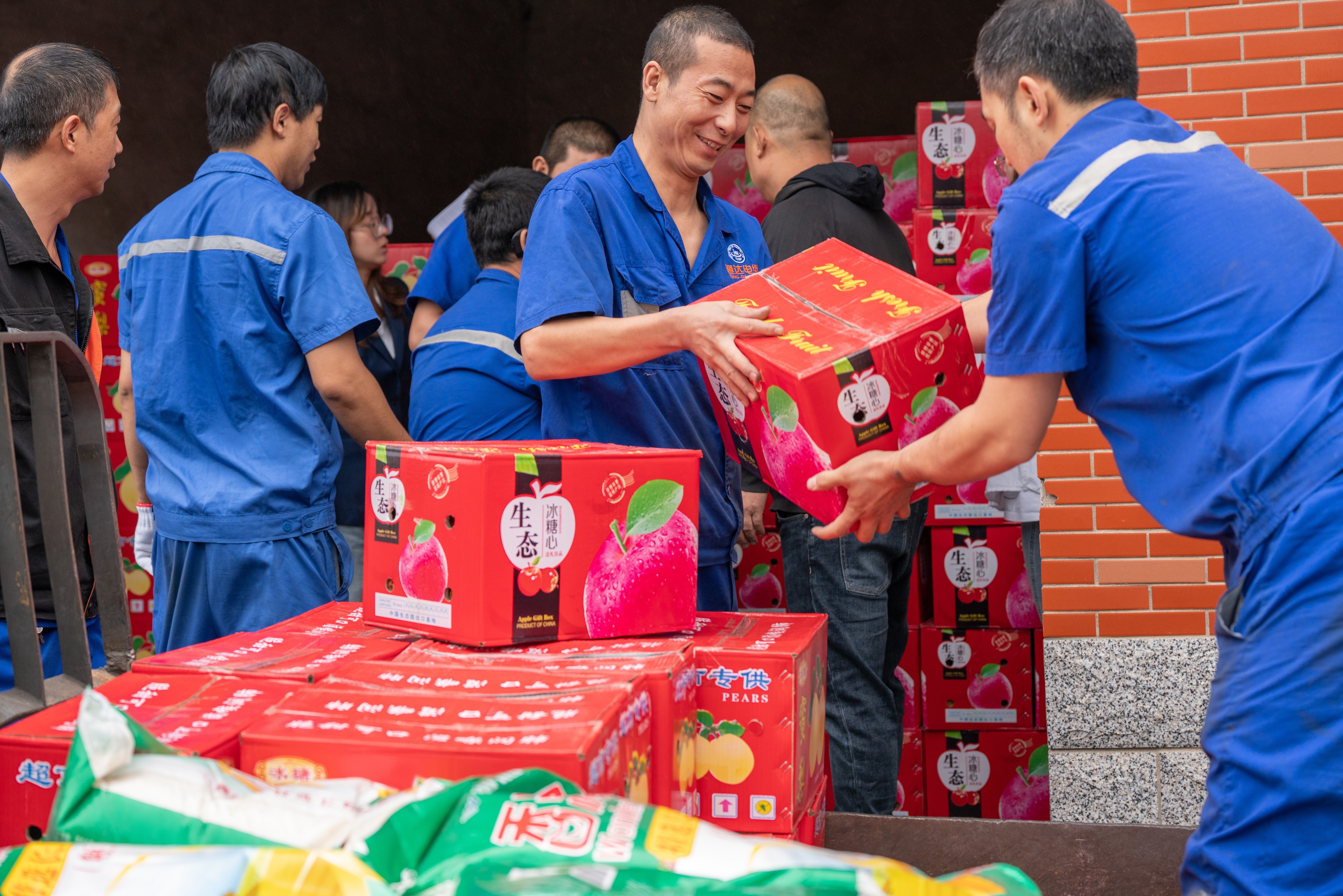 人头攒动、笑语欢声,福利发放现场气氛热烈,喜悦之情溢于言表,大家相互分工配合、相互协作帮助,迅速完成了福利领取工作。