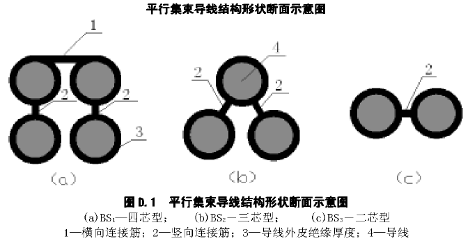 平行集束电缆一般采用四根导线呈正方形对称布置,导线之间由绝缘层及筋带相互平行的连接在一起(其它导体结构还有两等芯、三等芯、四等芯。)