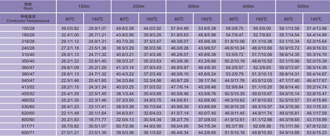 • 导线的线膨胀系数为钢的1/10,在最低温到最高温的运行温度范围内弛度小