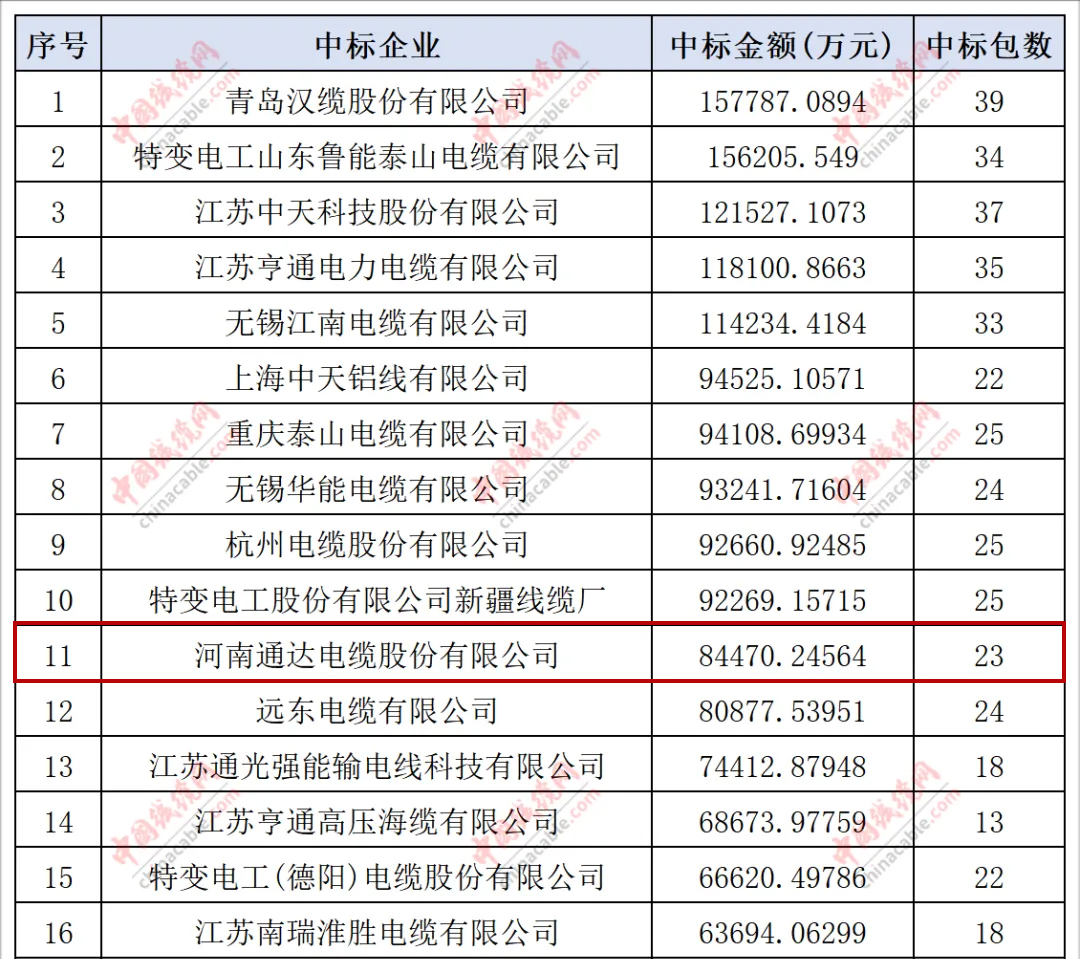 电线电缆被誉为国民经济的“血管”与“神经”,在确保我国电力稳定供应、促进经济稳健增长以及提升能源使用效率方面发挥着举足轻重的作用。截至2024年12月31日,国家电网总部和南方电网有限公司的2024年度线缆物资招标采购项目结果已全面公布,通达股份在2024年国家电网、南方电网总部线缆物资中标线缆企业排行榜中表现卓越,分别荣获第11名和第5名。