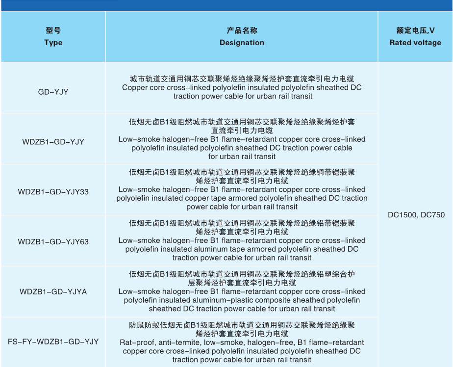 适用于额定电压1500V及以下城市轨道交通系统的直流电力传输,主要用于地铁、轻轨供电系统中牵引变电站到接触网的供电。