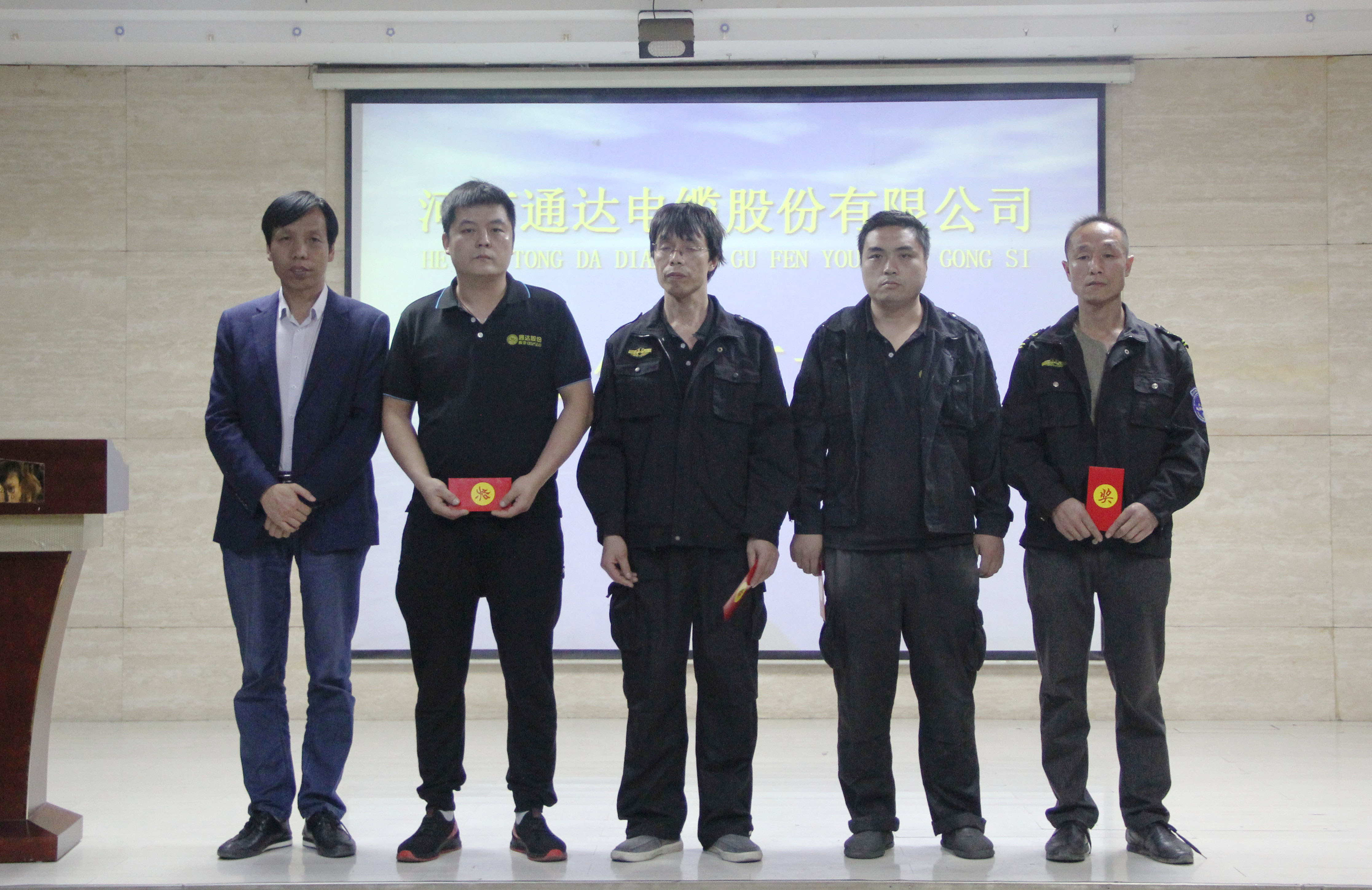 【概要描述】2018年9月30日,天气渐凉、秋叶泛黄,在国庆节来临之际,通达2018年第九次员工大会在大会议室隆重召开。本次会议由办公室樊主任主持,在热烈的氛围中,公司首先表彰了九月份表现优秀的三好班组和带岗师傅,公司领导为他们颁发了奖品并拍照留念。随后陈厂长做了九月份的生产总结和十月份的生产安排计划。严把生产环节,确保质量合格、监管到位,要做好资源节约,减少对原材料的浪费。 9月份三好班组:拉丝车间:三号拉